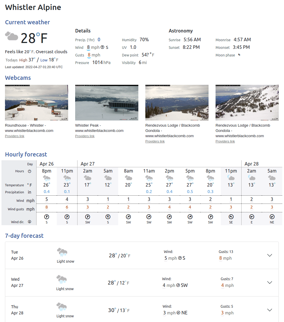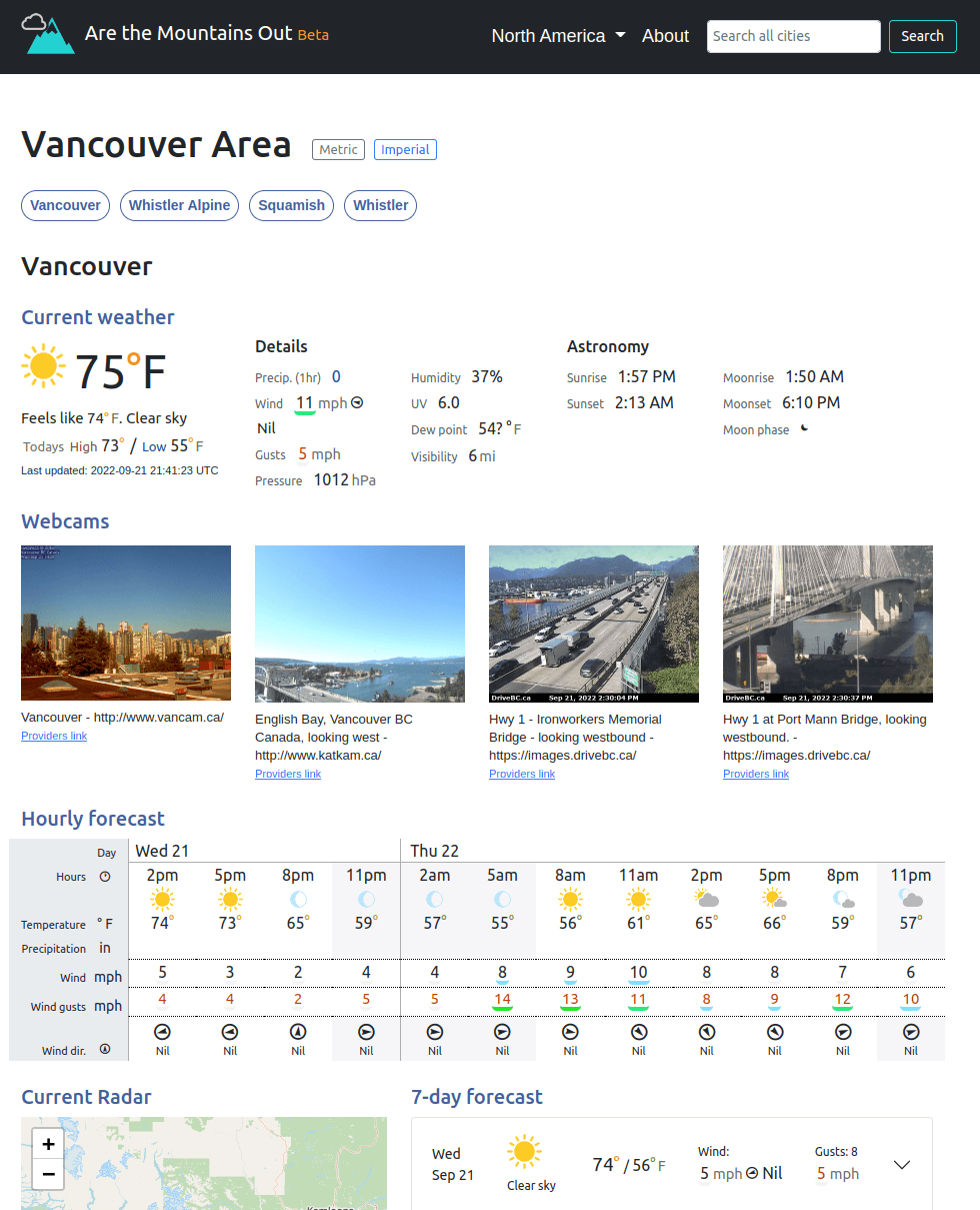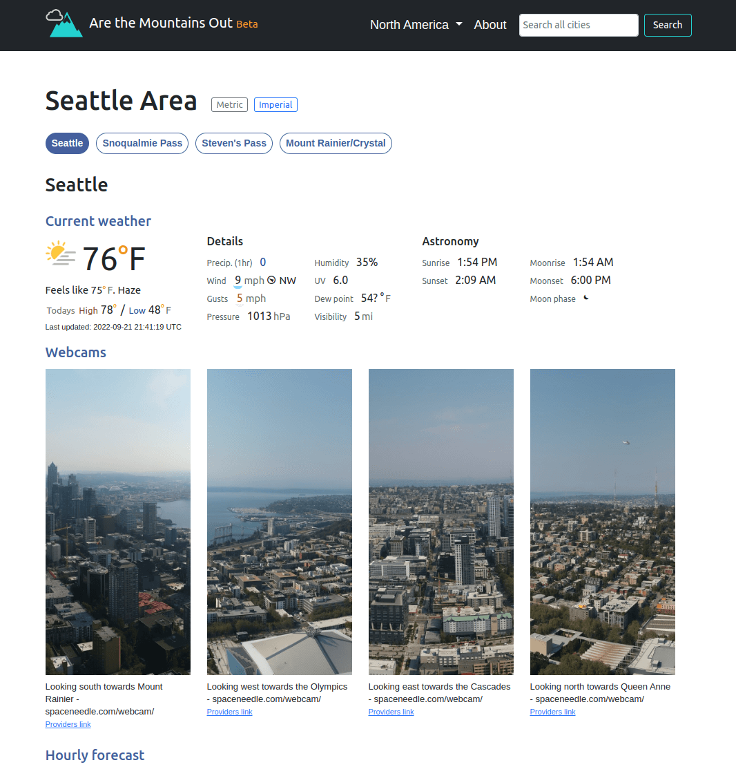 Intro: Living in Seattle, you always wonder if Rainier is out and what the weather is like in the surrounding mountains. I decided to solve that problem and build a little weather website that concentrates on outdoor centric cities and the surrounding areas that people like to venture too. Check out some of the cities I have curated - Seattle, Denver, Vancouver.